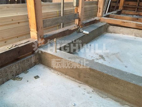 基礎の芯にアンカーボルト出し、土台を緊結していきます。