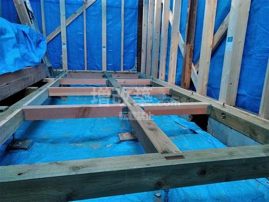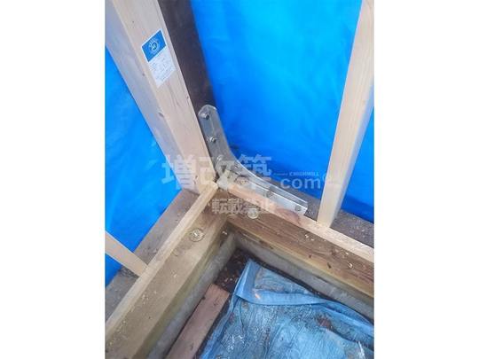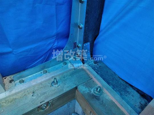 既存の基礎に内側より添え基礎補強しその際に、既存土台と柱、基礎補強新設部に1体補強の金物で固定、基礎補強後に補強部の基礎上端に土台を新設し、既存土台と新規土台をボルトで固定しました。新設土台にはアンカーボルトで新設基礎と固定しています。