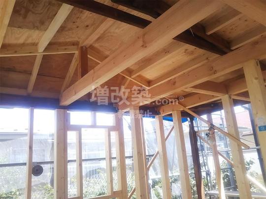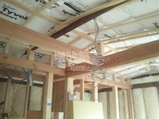 基礎が終わり大工工事へと移行します。構造躯体の強度を担保するためのメイン工事となります。M様の戸建てリノベーションの際、1階と2階がそれぞれ1部屋という構造から、大スパンの構造が必要となりました。