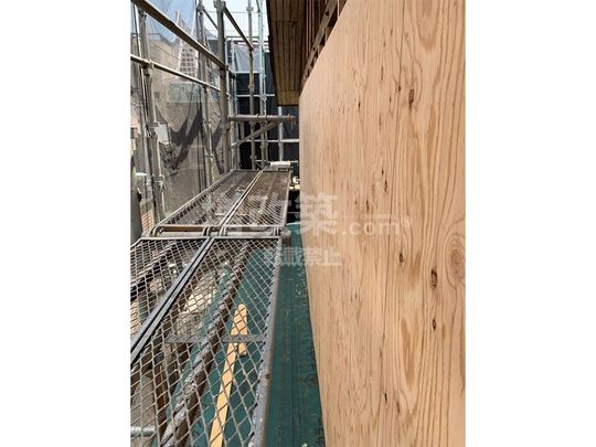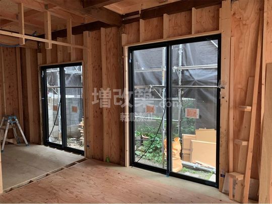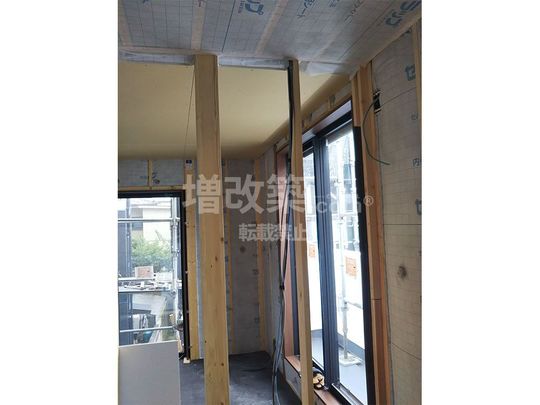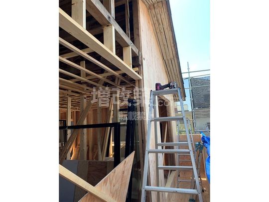 ▲補強が終わるとサッシ枠造作と外壁補強を行います。外周周りの主要構造体へ構造用合板を全面張りにし、在来工法+壁工法とします。