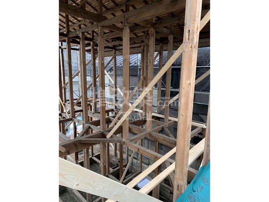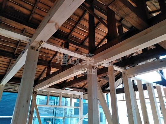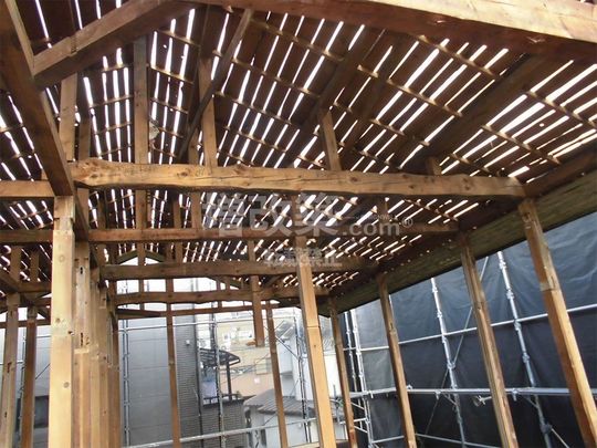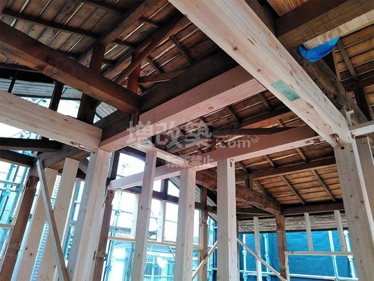 ▲2階は新設された構造体と既存の母屋組部との補強も入念に施工していきます。