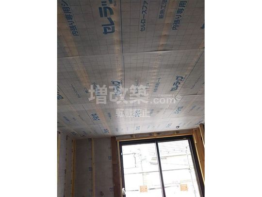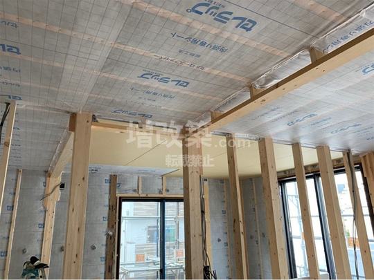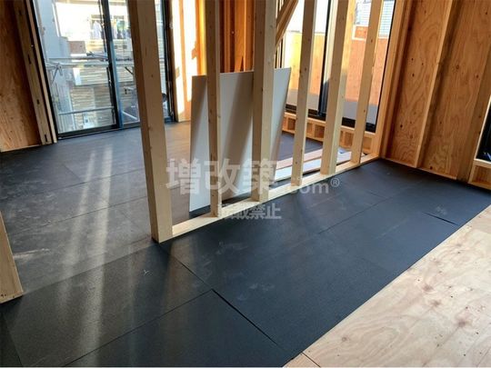 ▲外2階が子世帯の空間となることから階下への音も考慮し遮音シートを張っていきます。