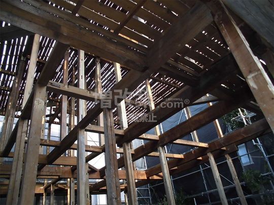 ▲2階部の多くの柱は抜かれ新たな構造体を組みなおしました。すべての継手と仕口に補強金物を配置します。