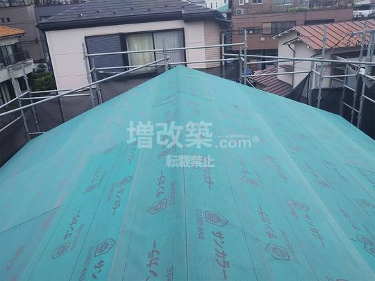 K様は屋根は既存の瓦葺きでしたので、既存の野地板に増し打ちをして新たな仕上げ材を葺いていきます。