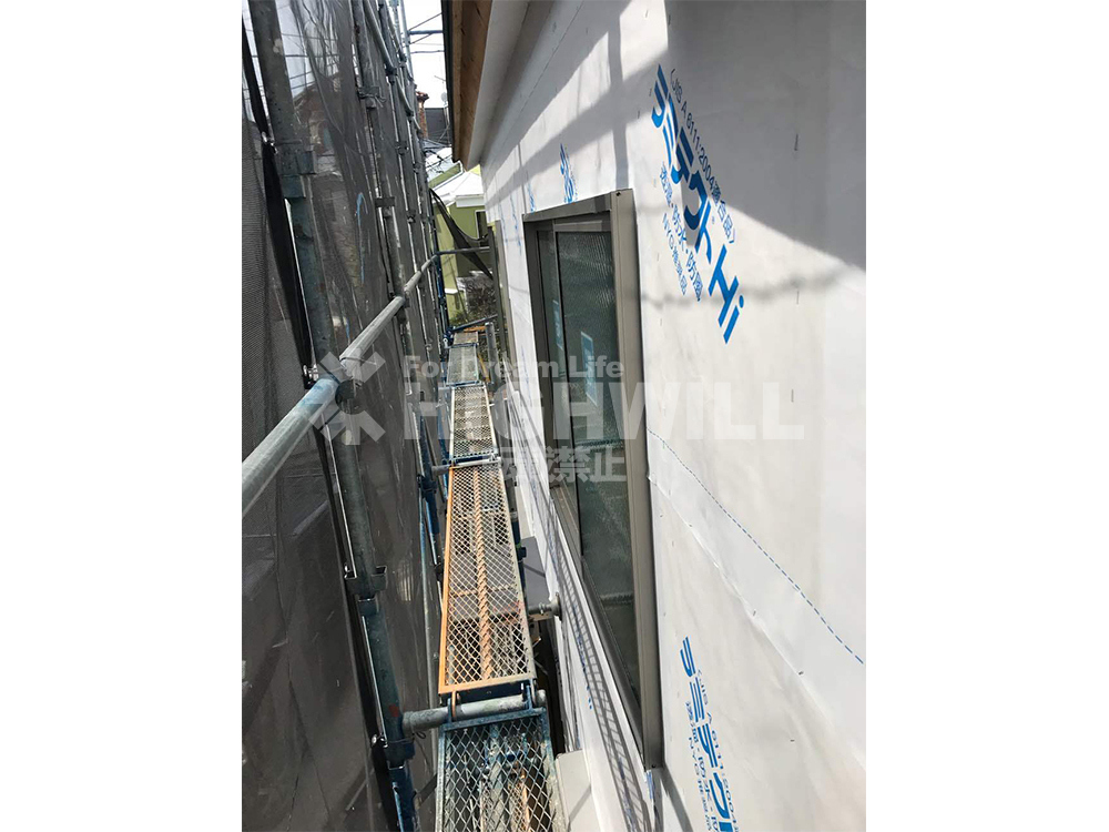 ▲防湿シート張りが雨仕舞の施工に最も差がつくところになってきますので、窓周りやダクト周りの処理を確実に行っていきます。