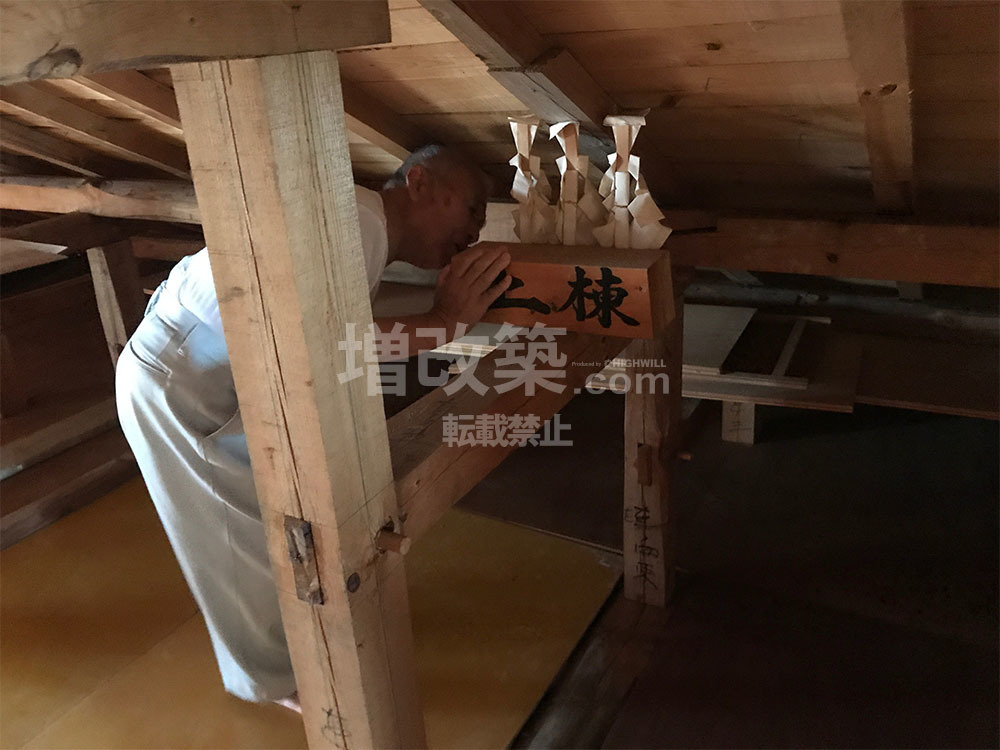 S様邸は内部解体と外部解体を分けて行いました。内部のスケルトン化(躯体状態)になった段階で、施主のS棟梁と弊社の棟梁とで構造状態のチェック、そして今後の補強方法について、入念に打ち合わせを行いました。S様の建物は築50年を経過しておりましたが、構造体はさすがに全く傷んでおりませんでした。使える構造体と取り換える構造体、梁の架け方など打ち合わせを行いました。