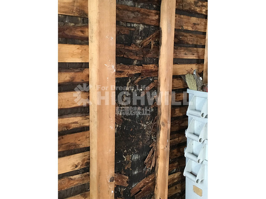 腐食していたザラ板を解体して剥離しました。通し柱も新たに入れ直す大工事となっています。