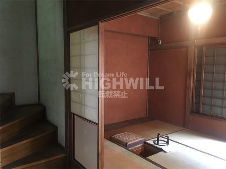 ▲マンション面に階段がある間取りとなっており奥の和室の窓からは小屋が見えます。
