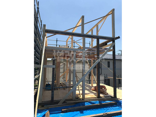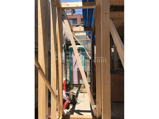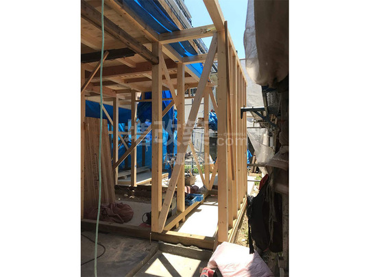 ▲解体の廃棄物処理が終わると、大工が入り仮筋交いの設置をします。解体職人では抜けない柱などは大工が抜き仮での補強を入れます。