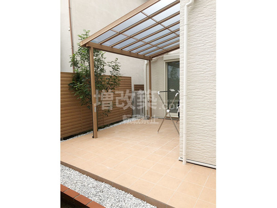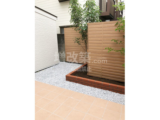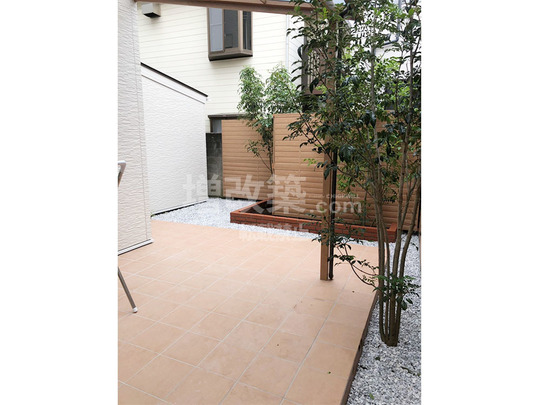 ▲お庭にはYKKスピーネを設置し床はタイルと周りは石を敷きました。