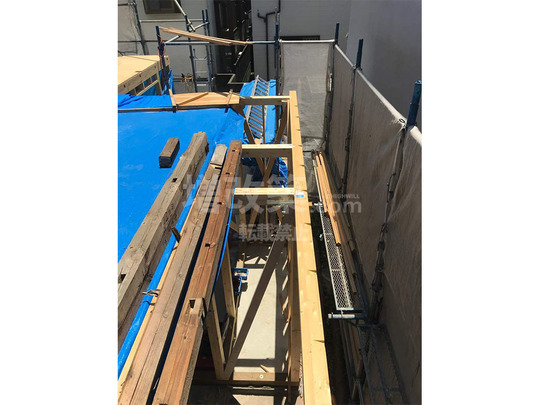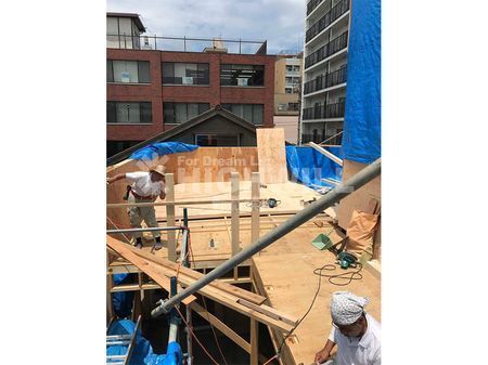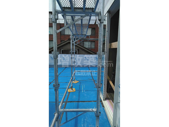 ▲一階の下屋だったスペースが全て屋上ルーフバルコニーテラスとなります。木造に最も相性の良い柔構造に対応した専用の金属防水工法を採用します。金属防水用の防水下地を製作していきます。