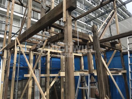▲足場を建てる際も傷が付かないよう細心の注意を払います。