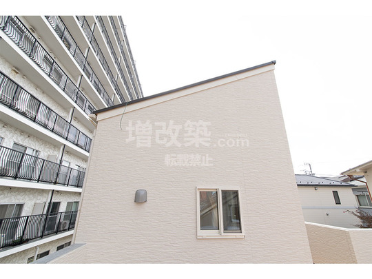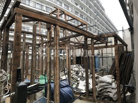 ▲マンション側に密着して建てられていました。長期的に構造躯体を維持すためには、密着させたままでは今後の弱点ともなってきます。I様と打ち合わせをし役所と協議の上、柱一本分中へ入れリノベーションする方針で工事をすることになりました。