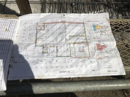 ▲I様邸はベタ基礎への基礎補強工事となりますので、耐圧版の厚さ、配筋の方法を基礎伏図で指示します。
