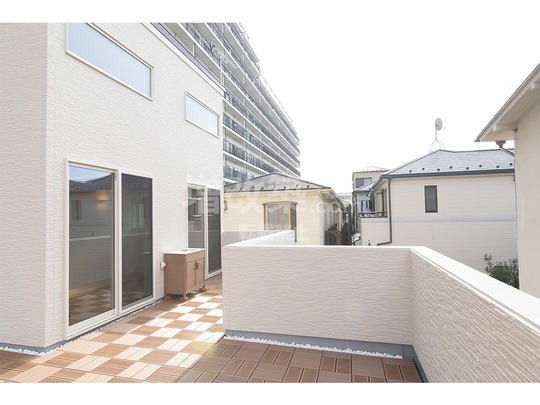 ▲裏のマンションを背負う形で建っており一階の下屋部分にバルコニーテラスをご希望されました。
