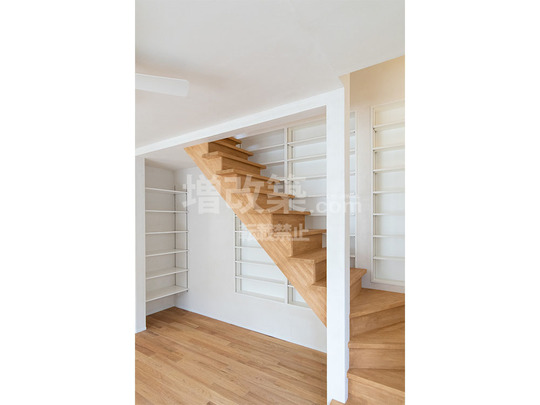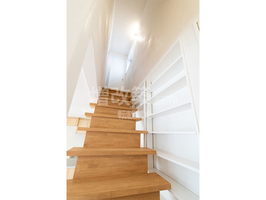 ▲造作階段の奥にある棚は本棚です。こちらも大工造作によるものです。