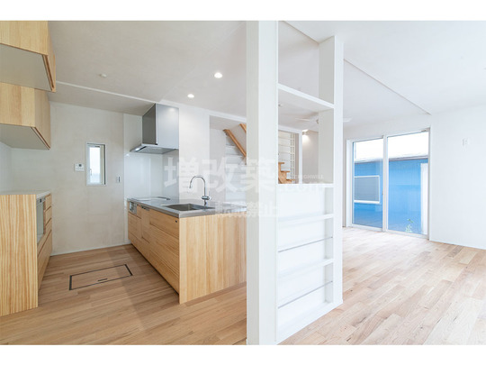 ▲キッチン裏面に収納と、右側には可動棚を設置しました。