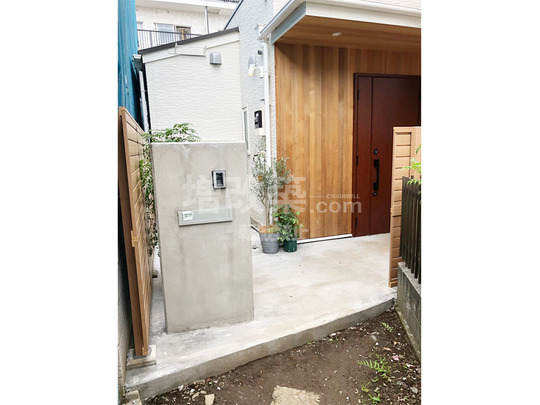 ▲門扉は付けずに、ポストとインターホンのみのシンプルな打ちっ放し風