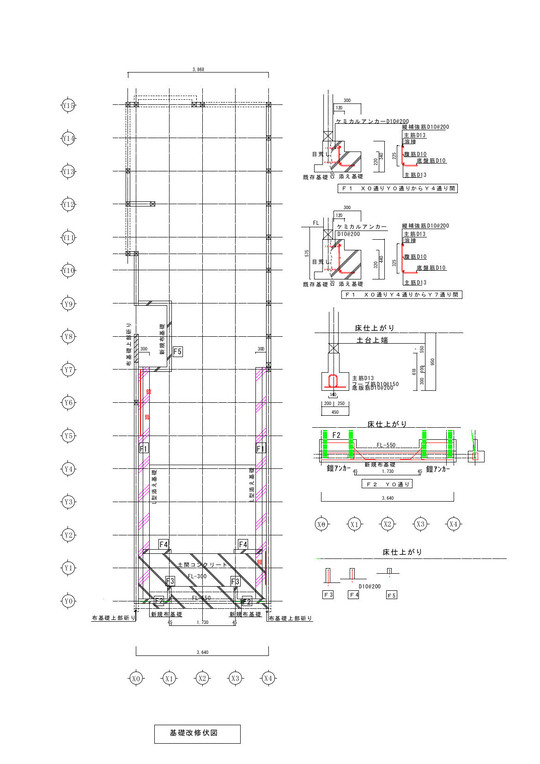 ▲主筋はD13仕様。既存基礎にケミカルアンカーで一体化をはかります。