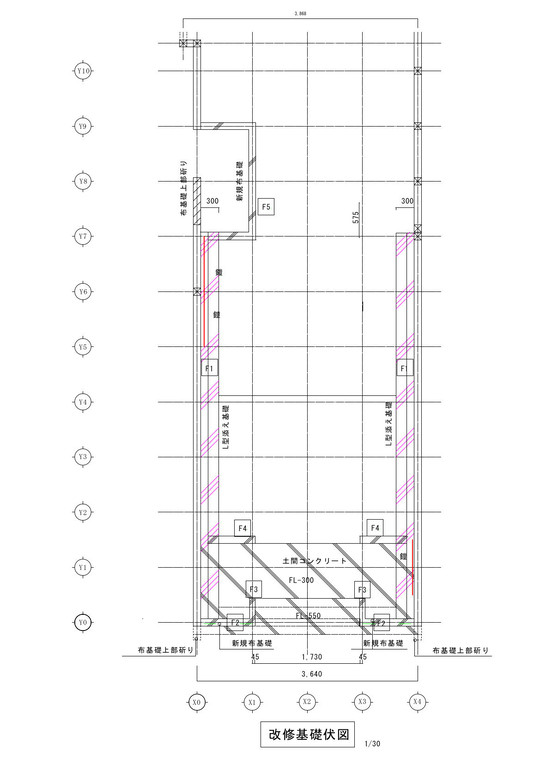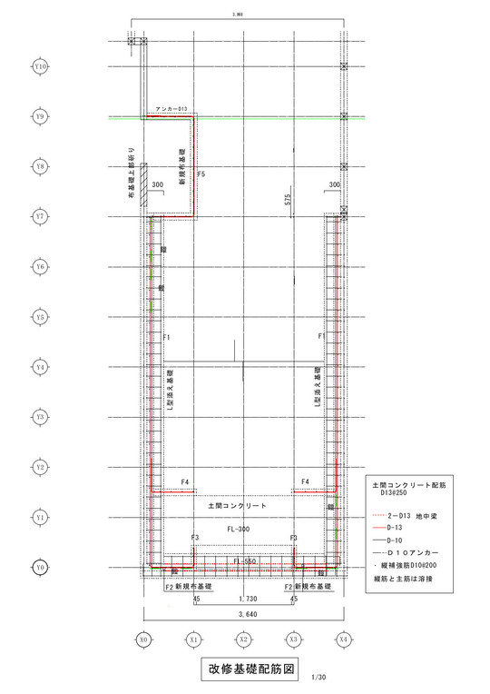 手前の旧家屋の基礎は無筋基礎であったために、ベース300㎜、立ち上がり基礎幅120㎜抱き基礎(添え基礎・増し基礎)補強としました。