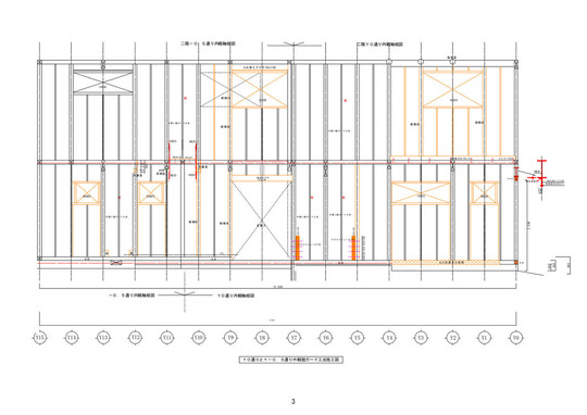 ▲軸組図に沿って施工していきます。隣家と接している面は455㎜ピッチに間柱を仮止めしていきます。