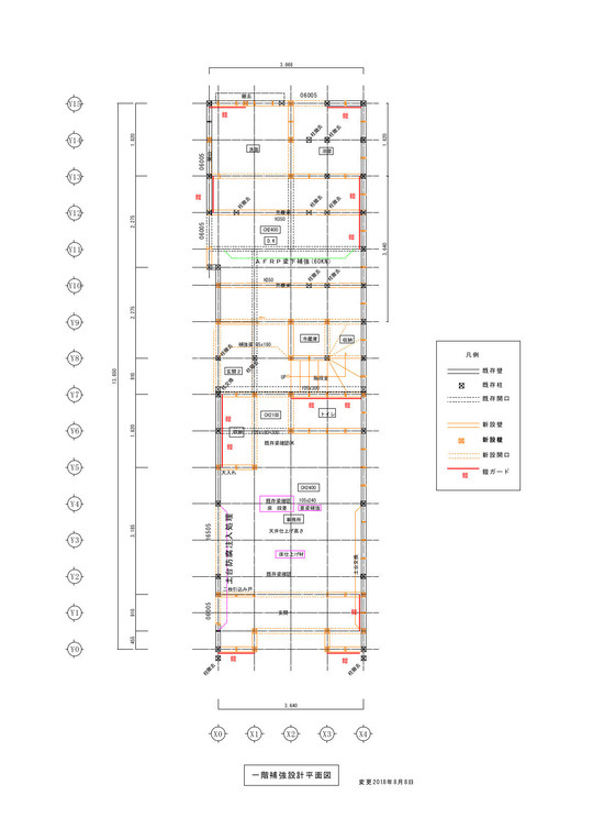 ▲ここに既存の店舗入り口部分は間口の両脇に柱が新設されるため、新規で布基礎を制作します。AFRP(アラミド繊維)の上部には壁倍率6.3倍の耐力壁が設置される為、土台・柱といった上部構造体の抜け対策をします。
