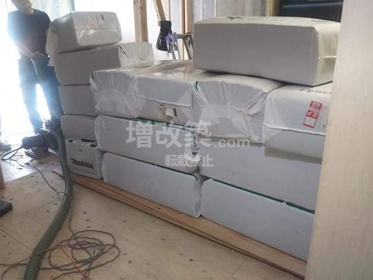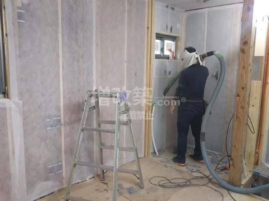 東京都大田区再建築不可というロケーションでのリノベーションですが、補強工程が終わると断熱改修へと移行します。断熱材は、セルロースファイバーを採用。
