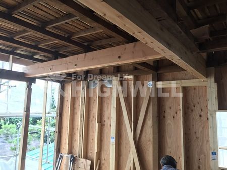 2階に娘様世帯のリビングルームが配置される計画となっておりますので、空間が広めに設計されております。そのため、梁を設置し開放感がある空間を作れる構造としています。