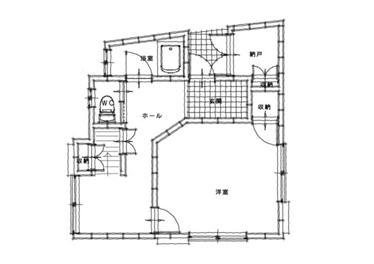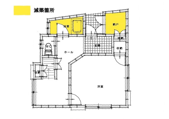 ●減築部のライン上となる想定の玄関部分。玄関ドアを開けたポーチ部分が減築対象のラインと想定しプランを作成しました。M様邸の既存の建物は柱が多いのですが、リノベーションプランは柱の本数がリノベーション後に減る想定となるために構造計算で軸組補強の方法を検討する必要があります。