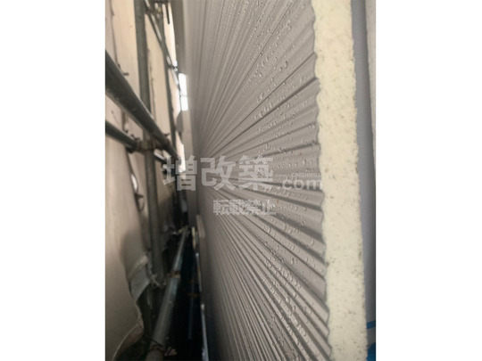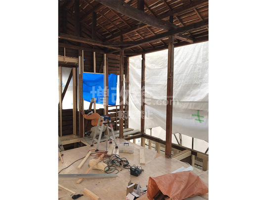 ▲M様邸の外壁の仕上げは、ガルバリウム鋼板を上張りとなっておりますが、写真奥の外周面は、隣家との距離がなく内部から外壁を解体し、内部から外壁材を張る「裏打ち工法」となりました。