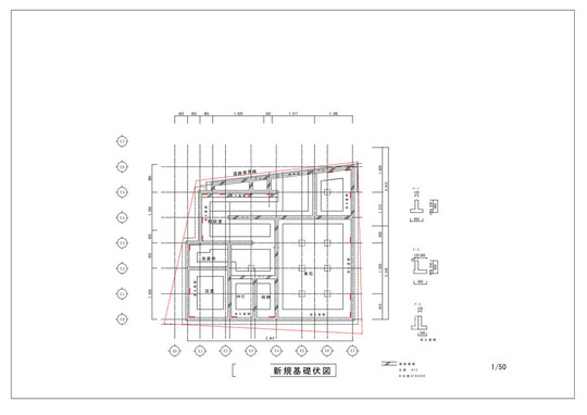 M様邸は傾きの補正がありましたので、ジャッキアップで傾き補正後に、基礎補強工事となりました。M様は「耐震等級3」での耐震構造となりますので、構造計算を行い、基礎補強の計画を立案します。M様邸は抱かせ基礎(添え基礎・増し基礎)による基礎補強工事となります。
