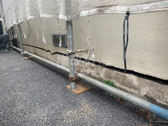 ▲裏打ち工法部分は室内より外壁を解体します。この際接近している隣家へ外壁が飛散しないようシートで保護します。