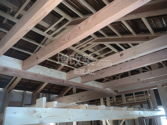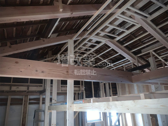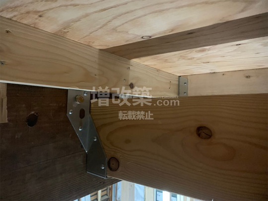 ▲ほぼ新しい木材での施工になってきますが、旧構造材への補強は、力が作用するのかを見極め細心の注意を払いながら補強をしていきます。