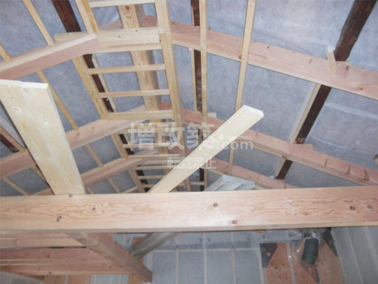 ▲屋根組と兼用して斜めにかけられた登り梁は 勾配天井にしたときに、梁を見せたくない場合などで採することが多い納め方のひとつです。