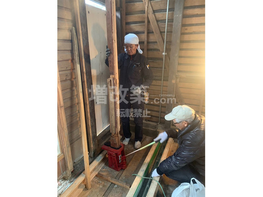 ▲一人がジャッキを操作し、もう一人は柱をサポート、その他のメンバーは建物が上がる為、動きをチェックします。