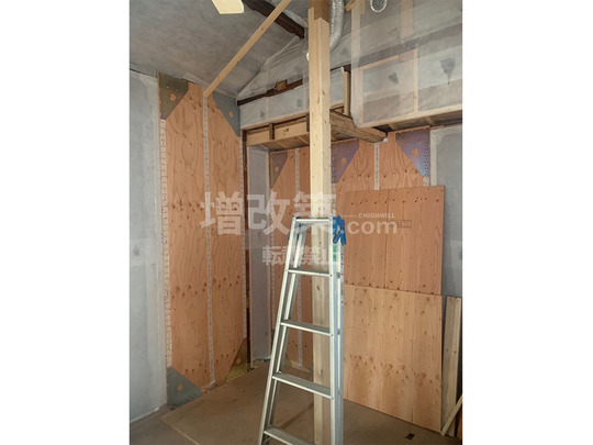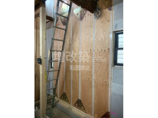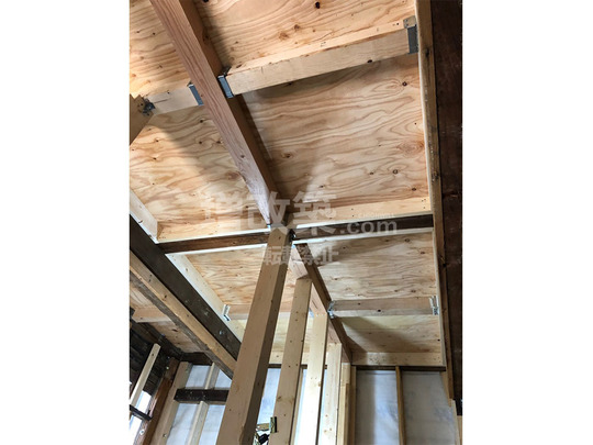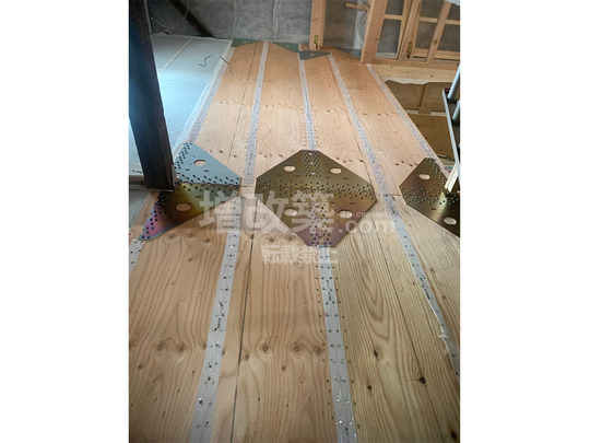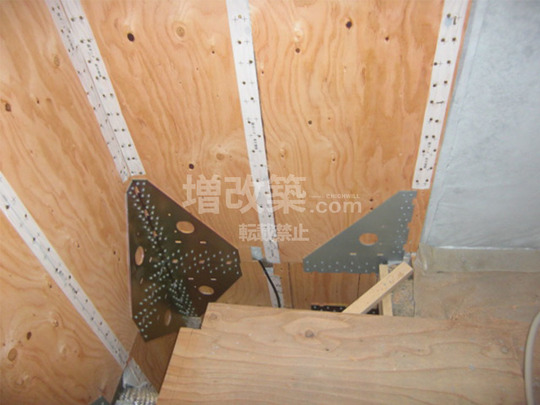 ▲補強計画に基づき必要箇所には構造用合板を張り補強ガゼットを設置していきます。