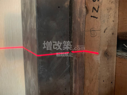 ▲すべての柱にレーザーを当て何㎜傾いているかを墨出ししていきます。