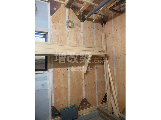 ▲M様邸の戸建てフルリノベーションでは断熱材はセルロースファイバーを採用しました。セルロースファイバー充填後は、耐震等級3での補強計画に基づき、必要箇所へは内壁に構造用合板張りの上、補強ガゼットでの補強となります。