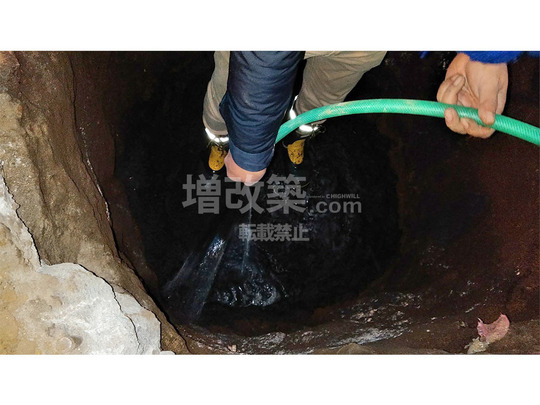 ▲新築の炭埋は水の支給が頂けないケースがありタンクが必要になることがありますが、リフォームのケースでは水道をお借りできるためスムーズです。