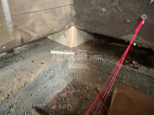 ▲ジャッキアップ後3.5寸角を仮で埋め木します