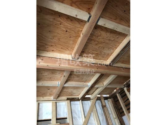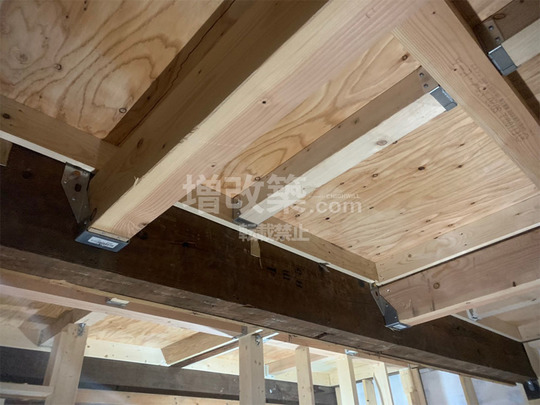 ▲大梁と床梁、床梁と構造用合板は金物でしっかりと緊結固定します。