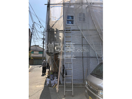 ▲2階の奥の1面は隣家との距離がなく、足場がはいりません。外壁は屋内から外壁を解体する裏打ち工法で外壁を新設します。