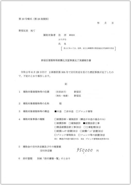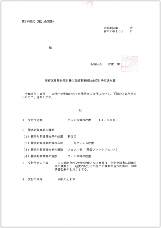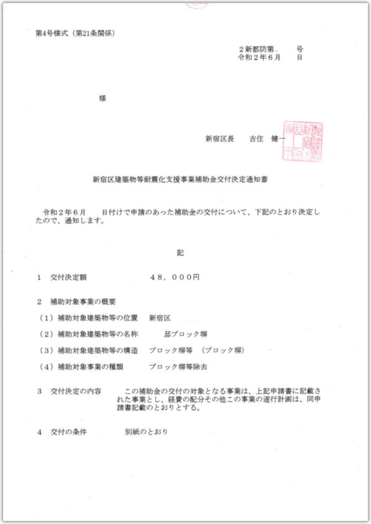建物の内見をさせていただき耐震構造を含めた内外スケルトンを1300万程度で収めたいとのご希望でした。予算をオーバーしてしまう事もあり新宿区の耐震改修補助金とブロック工事の補助を提案させていただきました。補助金の利用のケースでは、スケルトンリフォームでは役所とのやり取りも、通常の単純な耐震補強工事と比較し、複雑化しますので工期が長引くケースがあります。S様は既に家をお持ちでいたので、工期に余裕が取れることから補助金採用の方向でお話が進みました。