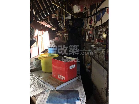 店舗カウンター内部。残置物が多く土台等の調査が内部から難しい状態でした。