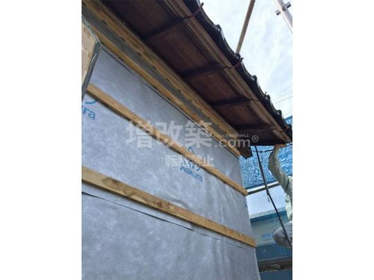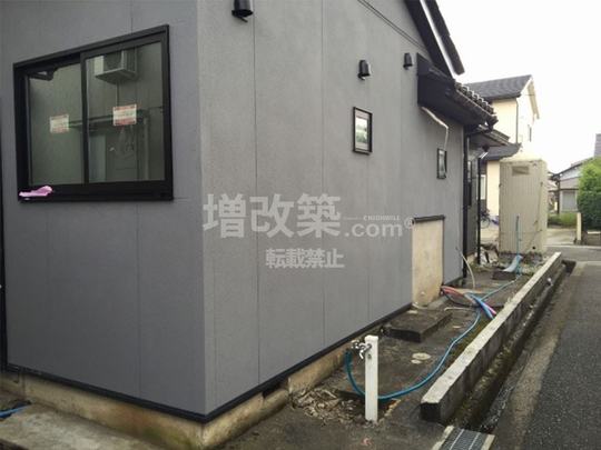 外壁のリノベーションは16mm厚の窯業系サイディング張りです。玄関廻りはアクセントとして柄のある塗装板を採用し、その他の部分は無塗装板の幅広のサイディングにアクリルリシンを吹き付けます。