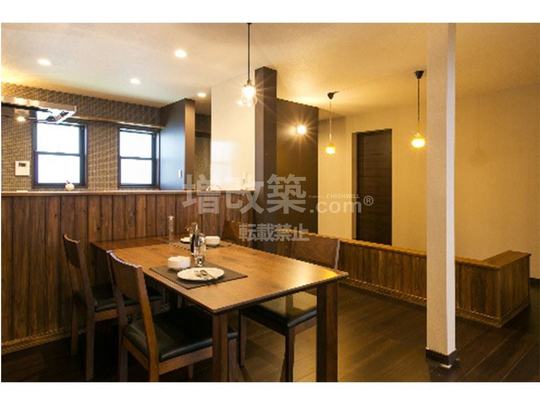 フローリングなどの木質部分やアクセントクロスをシックな色合いでまとめ、電球色の照明器具をご選定いただいたのでヴィンテージ風のイメージになりました。