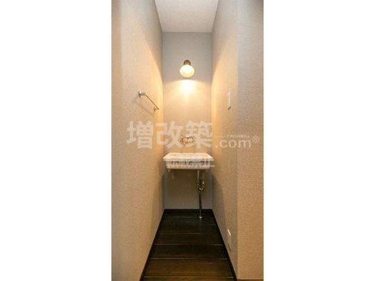 既存トイレは浴室同様タイル貼りで寒いと伺ってました。ただ、近年多く見られるタンクに付属している手洗いやトイレ内に設置する手洗いより既存のようにトイレ外での手洗いスタイルは気に入っているとの事でしたのでそのようにご提案させていただきました。