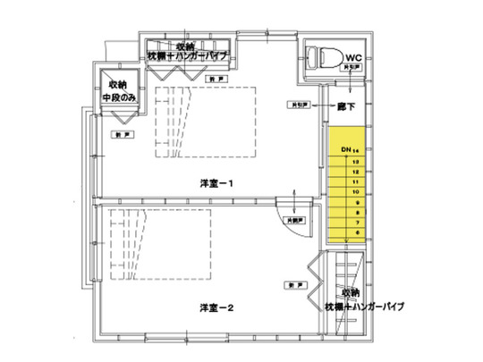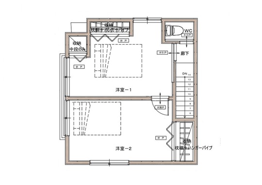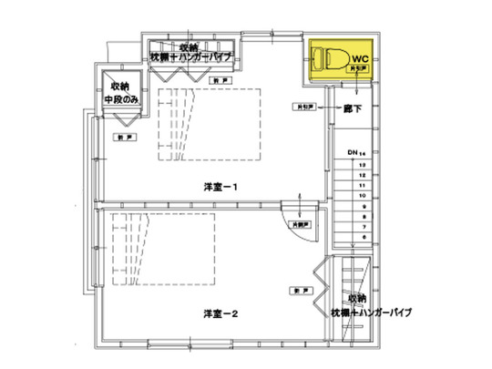 2階は、配置はそのままで階段を緩やかにし2階に新規でトイレを設置しています。