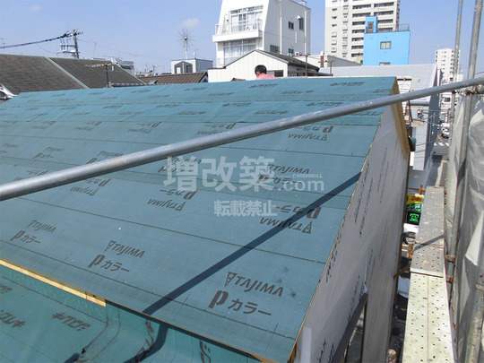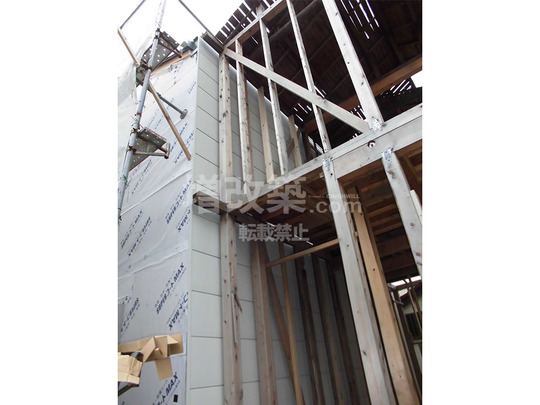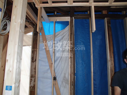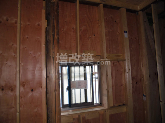 ▲隣家側を除く外周面には構造用合板を下地として張り、隣家側は内側より張り、偏心率を下げました。
