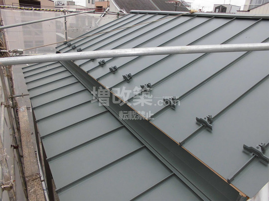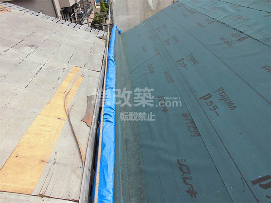 ▲隣家側の軒先はほとんどくっついているといっていい状態です。シートを屋根から巻き込んでいるのは、外壁解体を内側より施工するための養生です。